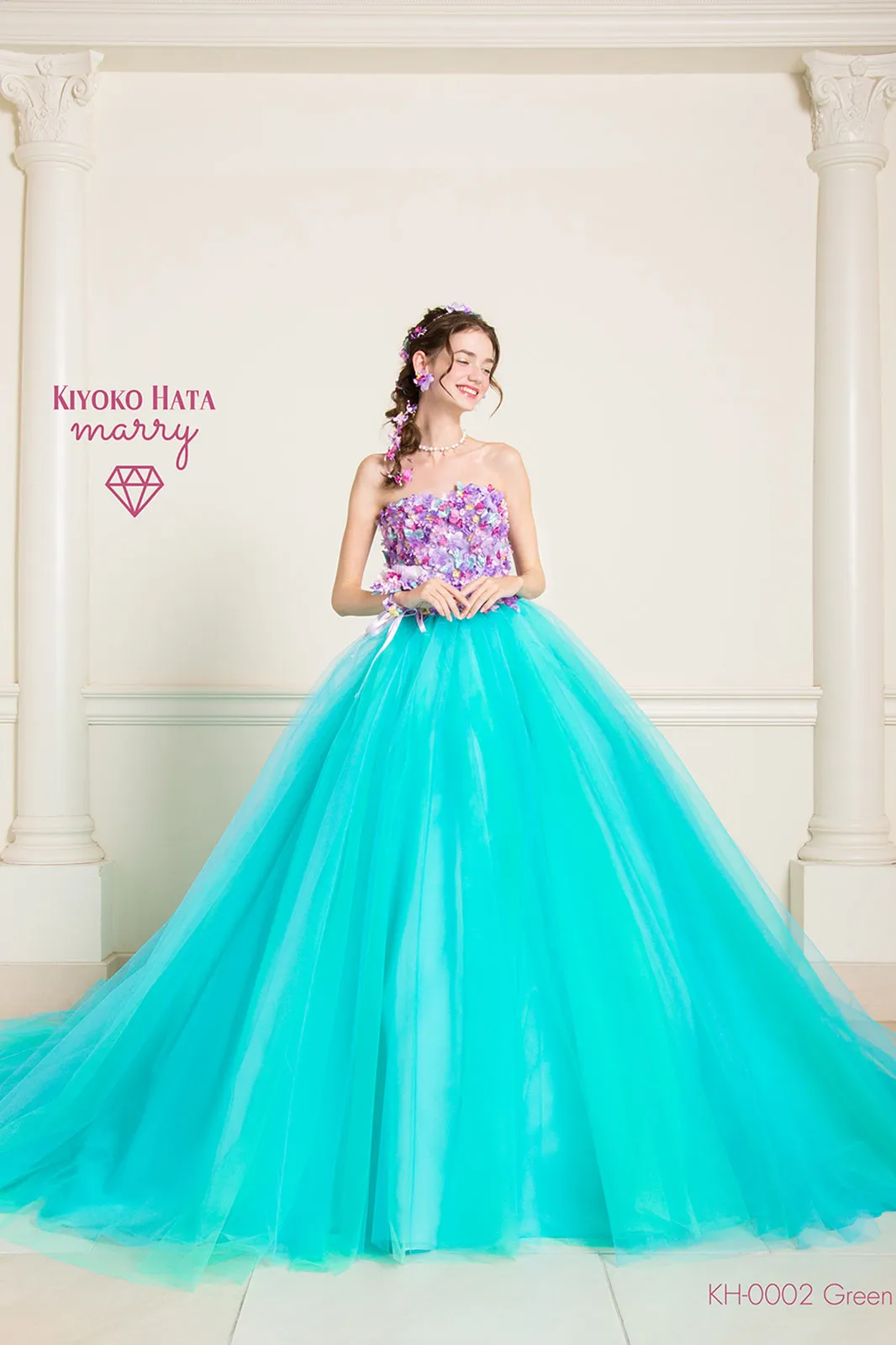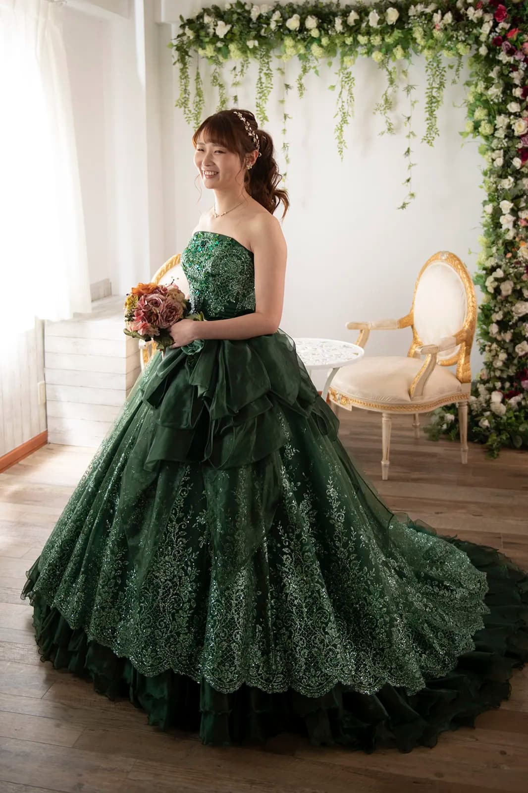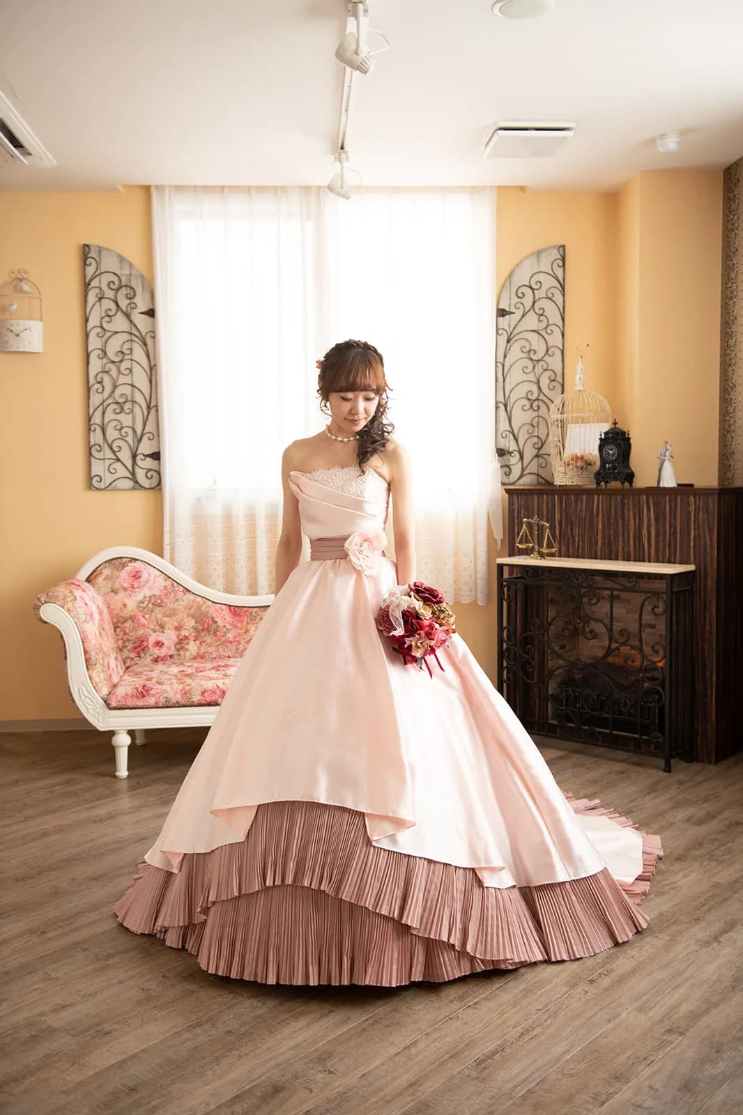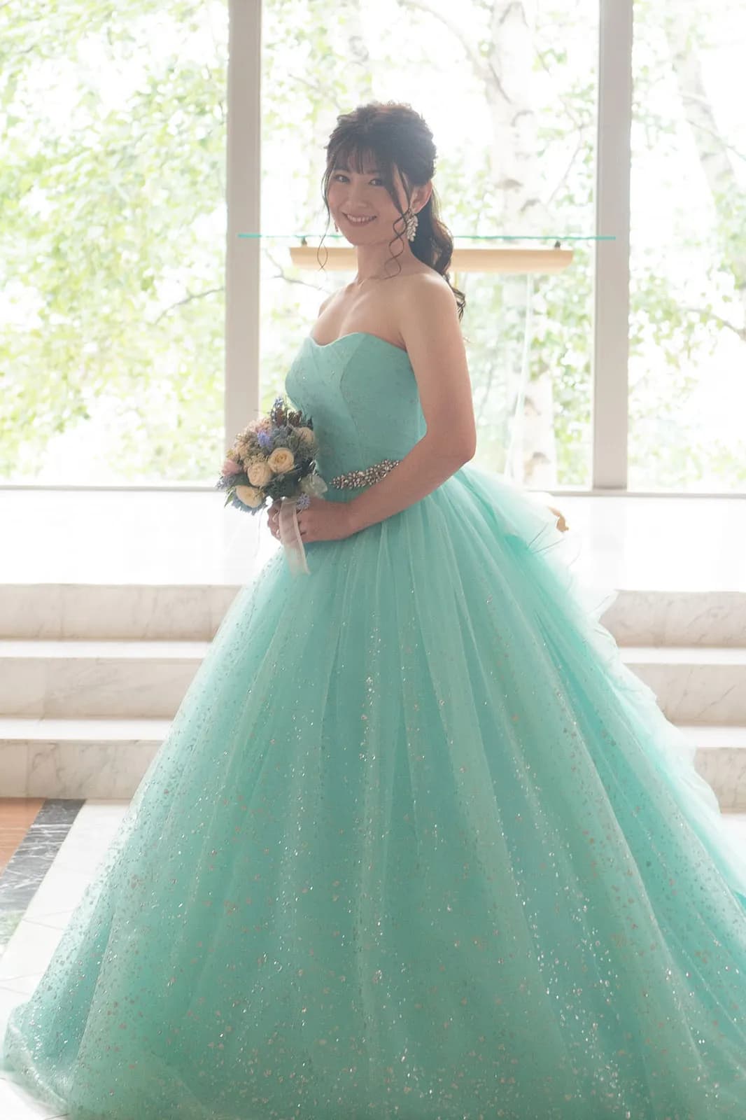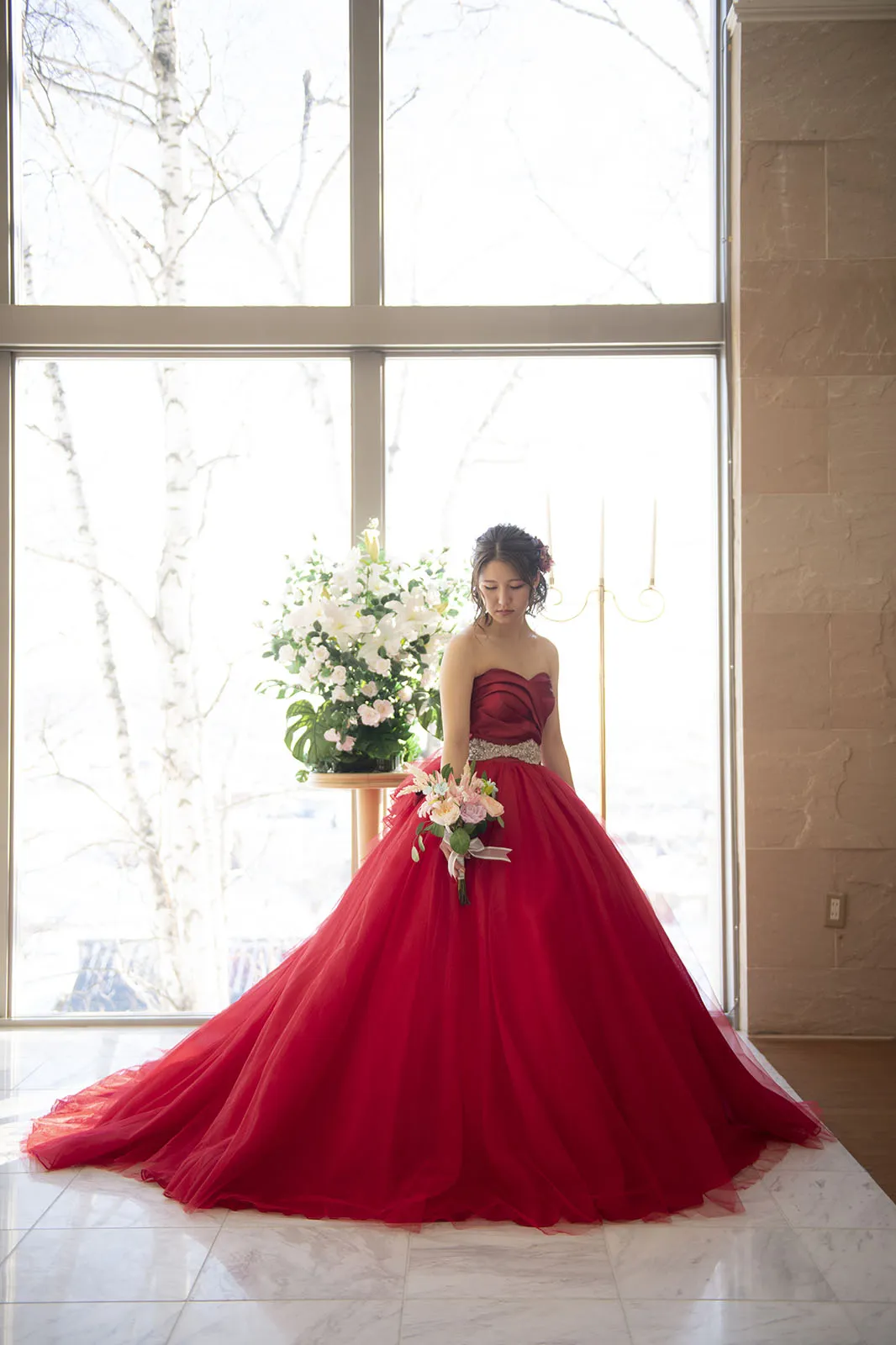カラードレスは多彩なお色の中からの選択となりますが、自身の好きな個性を表現できるドレスを見つけるためには、 季節感や、披露宴会場の雰囲気を考えると、より素敵な花嫁姿を実現できるでしょう。 また、ウエディングドレスと全く異なるラインを選ぶことで、ギャップを楽しむこともできます。 キャンドルサービスや、お客様のお見送り等、列席の方との距離が近いことが多いので、 アクセサリーやブーケもトータルコーディネートされることをお勧め致します。