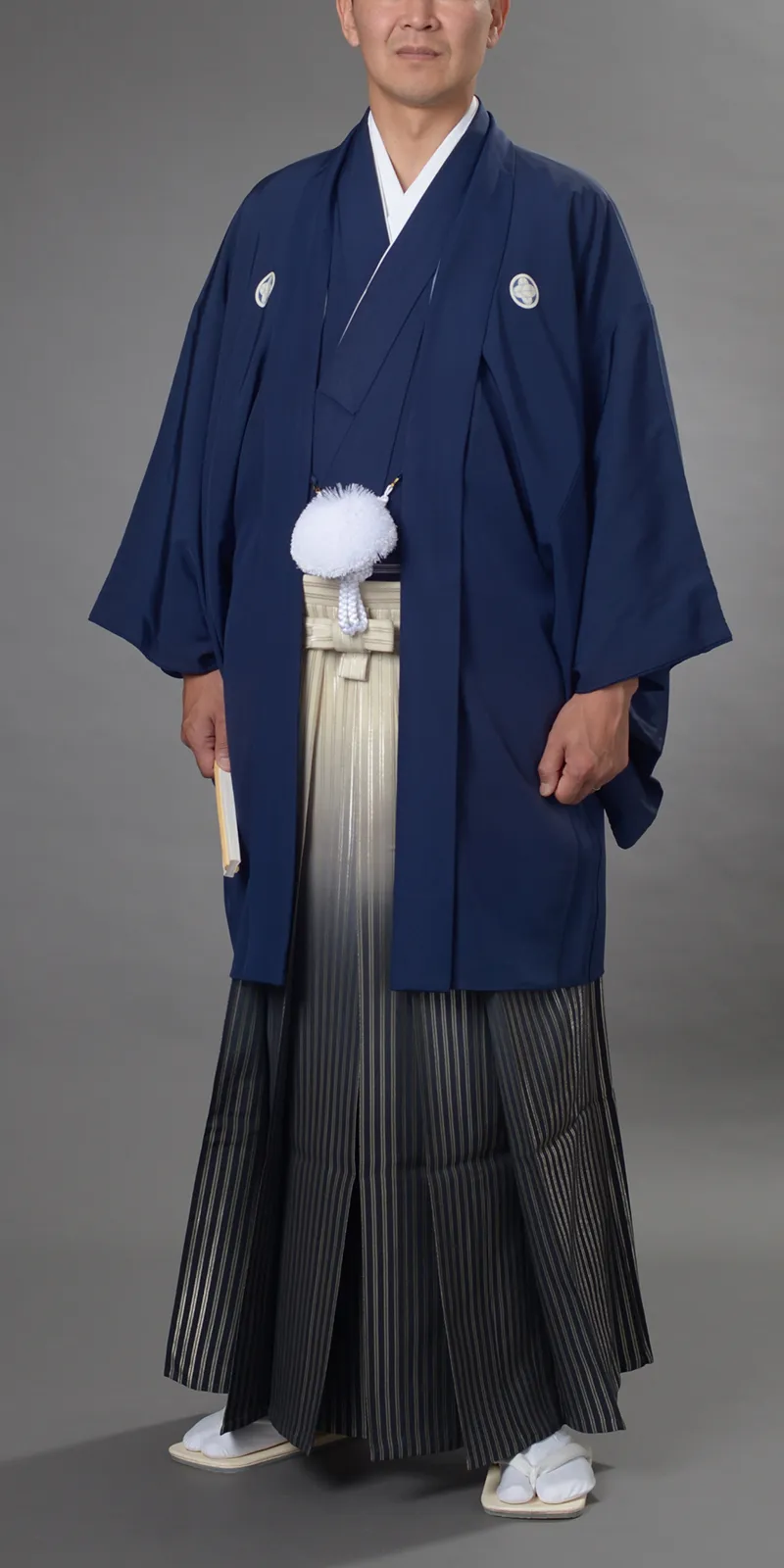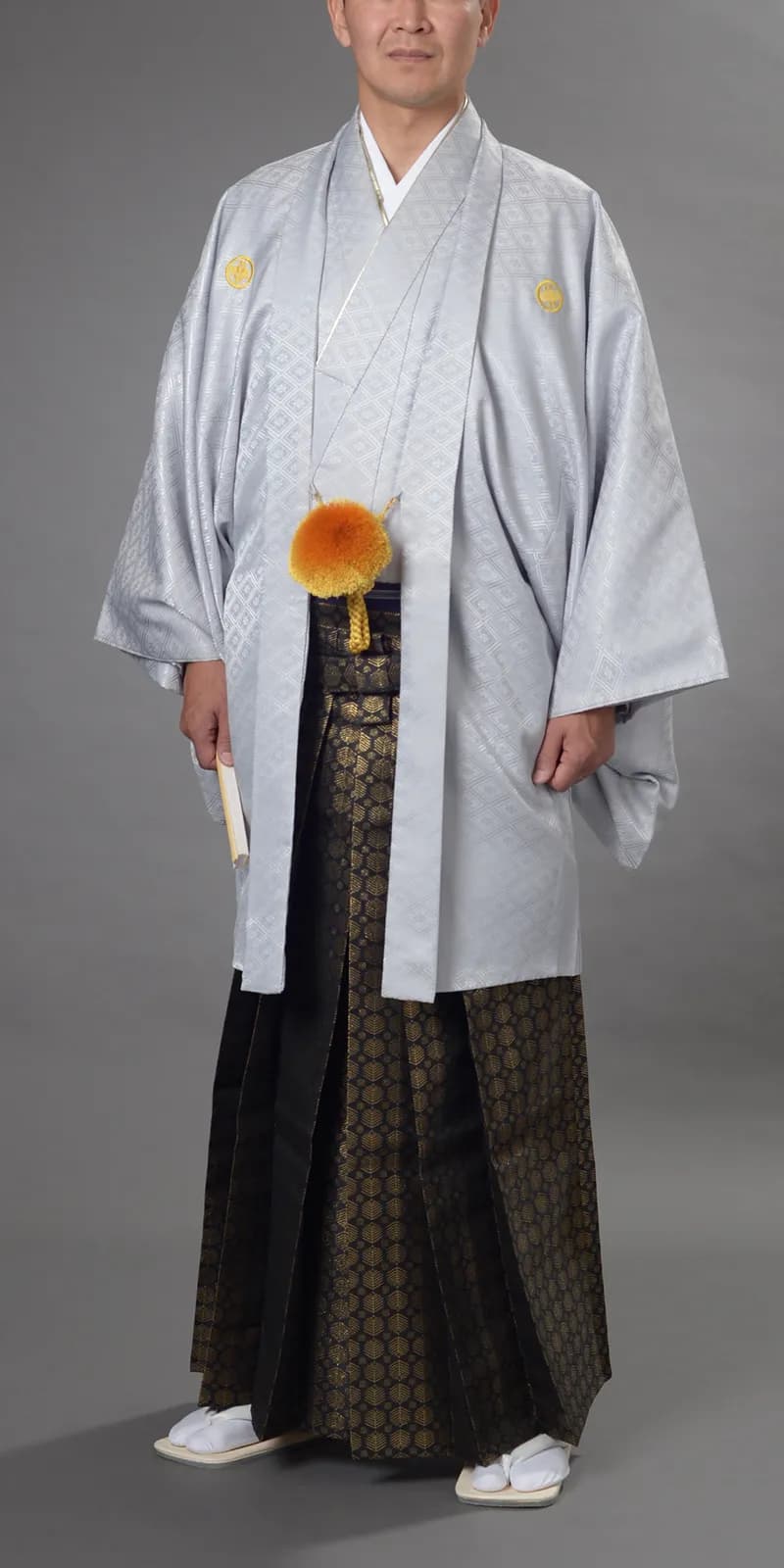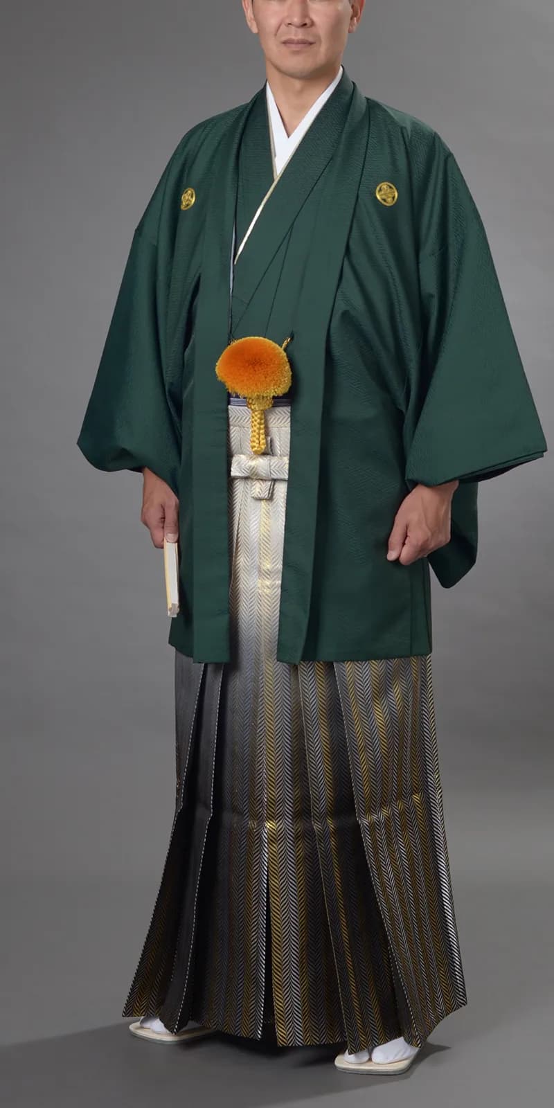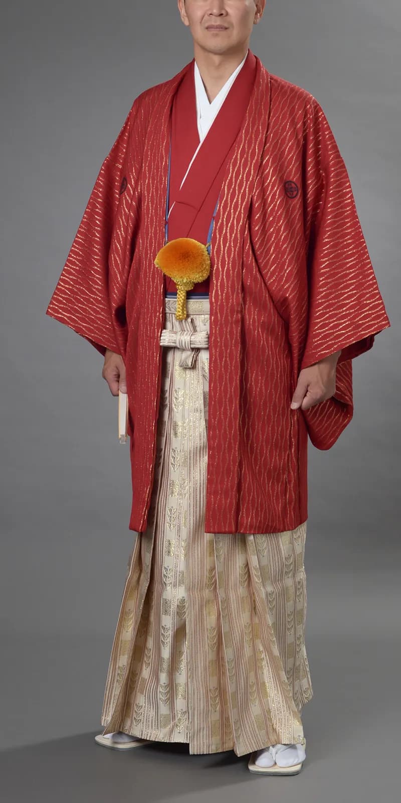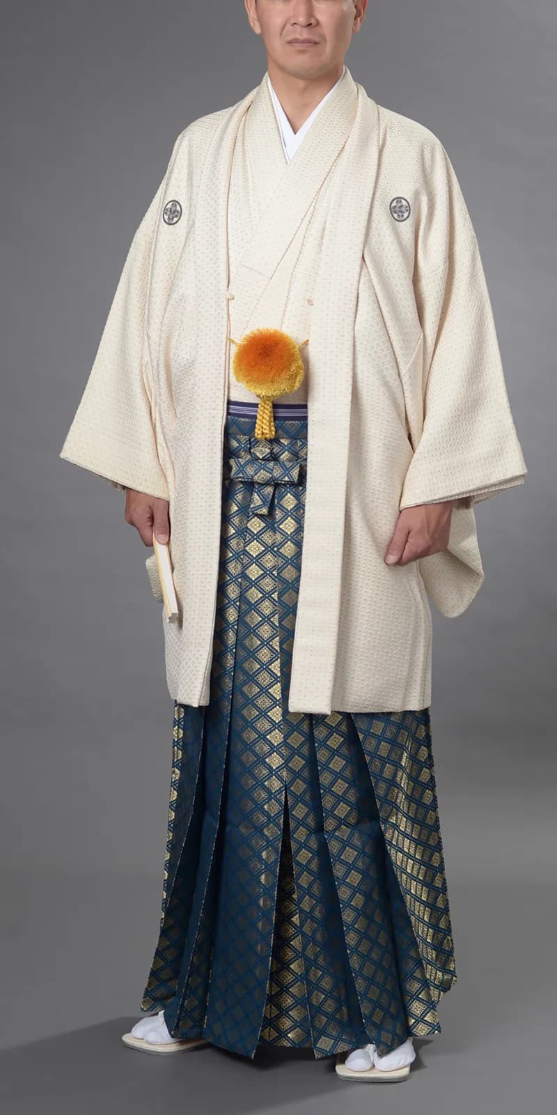 男性の第一礼装は正絹黒羽二重・五つ紋付に、袴は仙台平が正式ですが、最近は花嫁の打掛とも調和のとれる紺、 グリーン、白等の紋付も人気があります。袴も柄物、ストライプ、光沢感のあるもの等バリエーションに富んでおり、 品格のある花婿の凛々しい、洗練された特別感をもたらしてくれます。