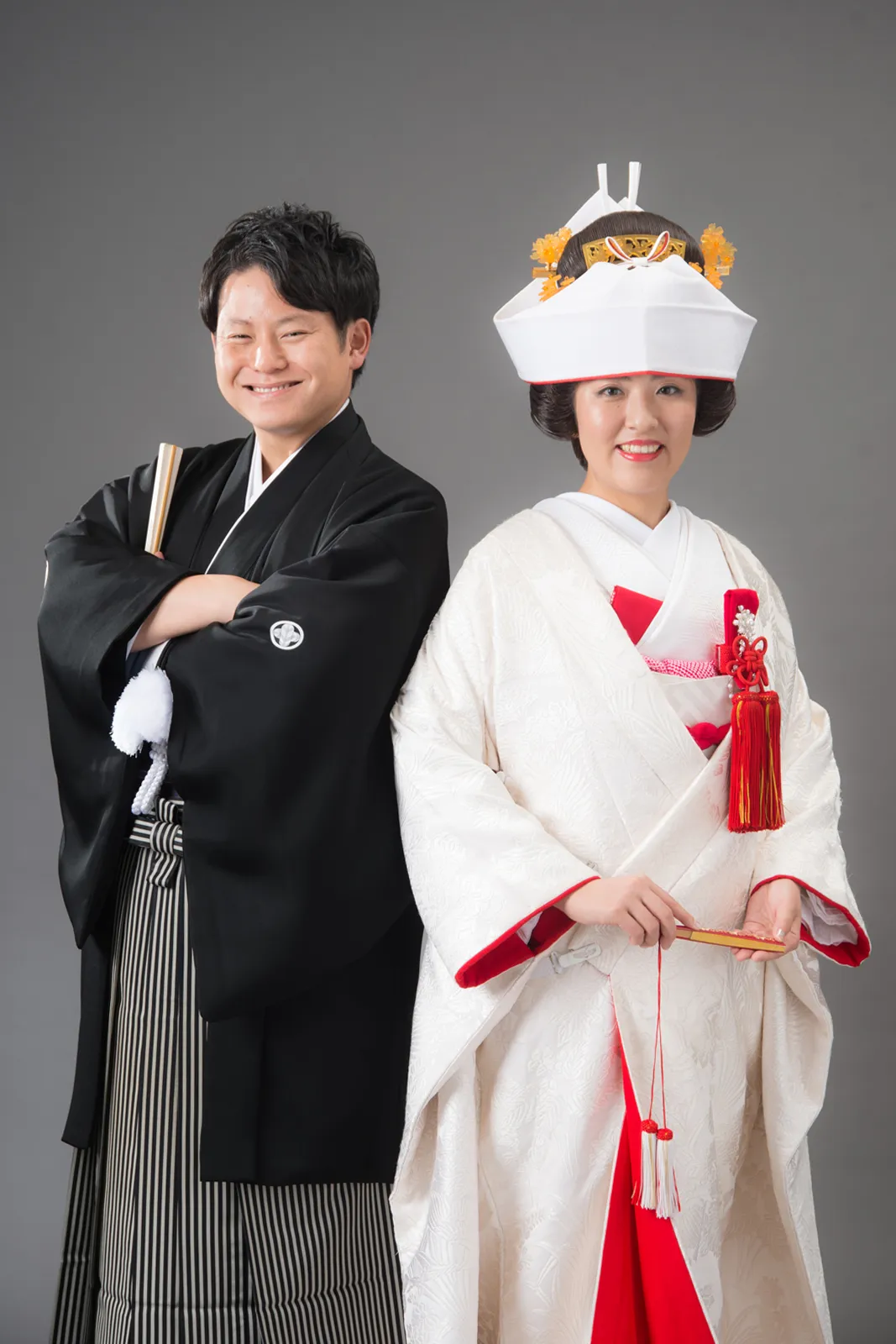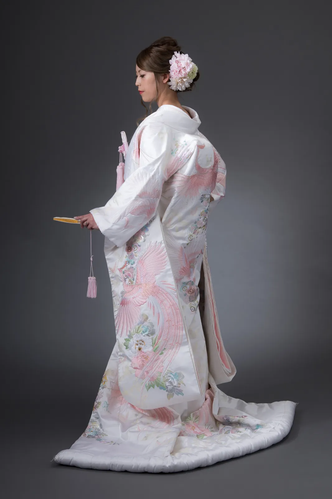 日本古来の婚礼衣裳として長い歴史を持つ白無垢。打掛から掛下、帯、小物まで全て白一色に統一した花嫁姿は純真さ、 清浄さの象徴と言えるでしょう。白は日本において神事の色として特別視されていたことからも、 婚礼という行事が女性にとっていかに神聖なものであり、新たな人生を歩むための強い決意が込められたものであるということがわかります。 かつらに綿帽子もしくは角隠しを付けた花嫁からは伝統的で崇高な精神美を感じさせられます。