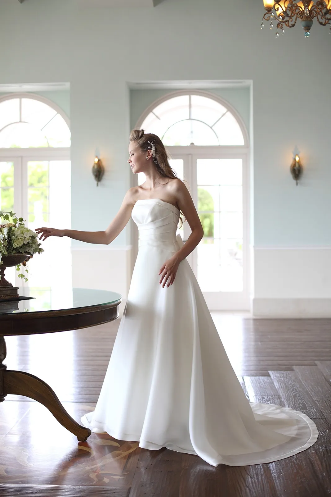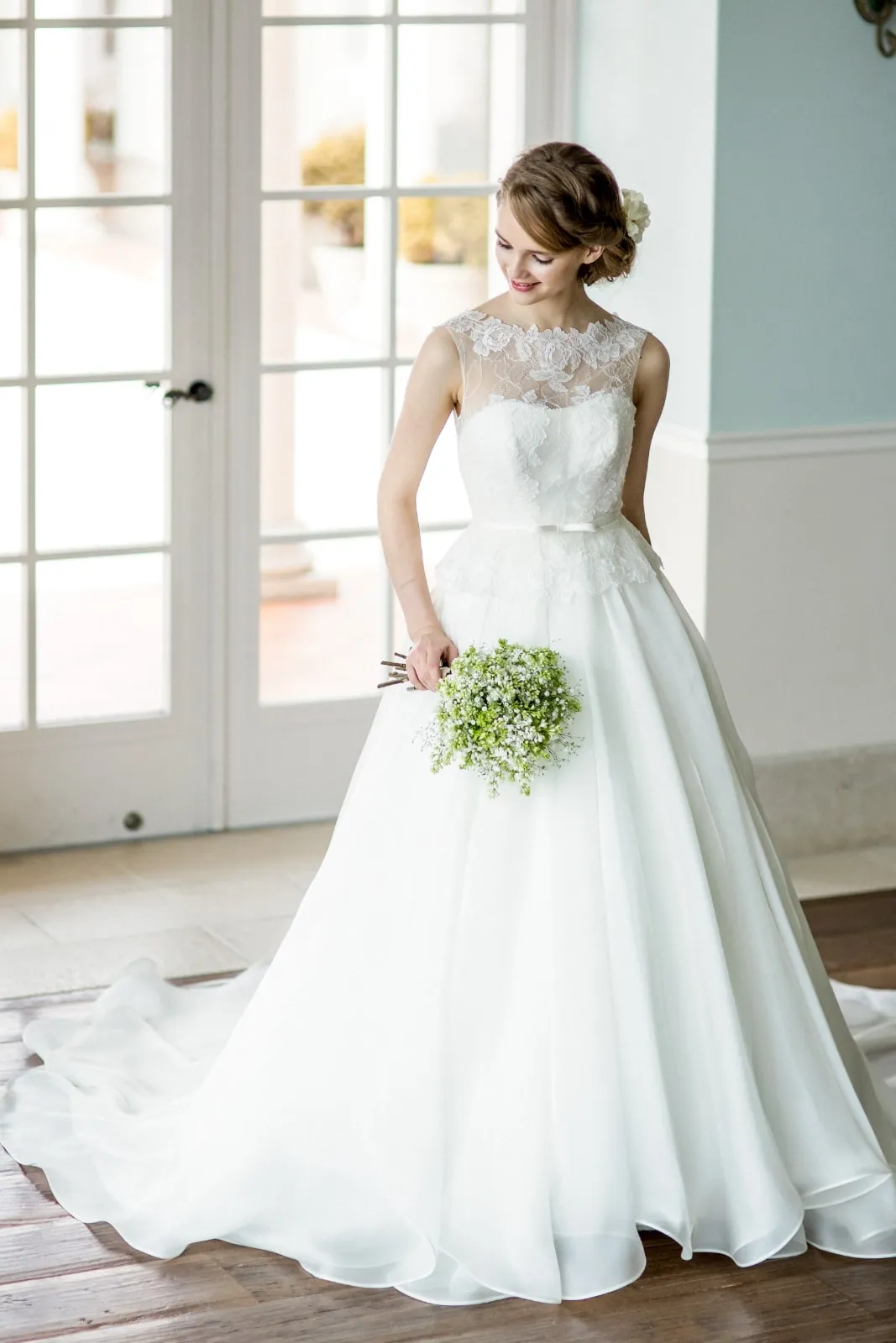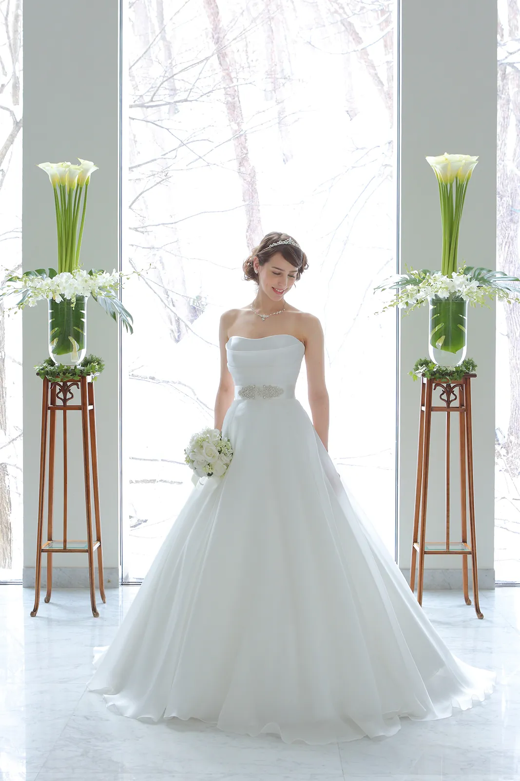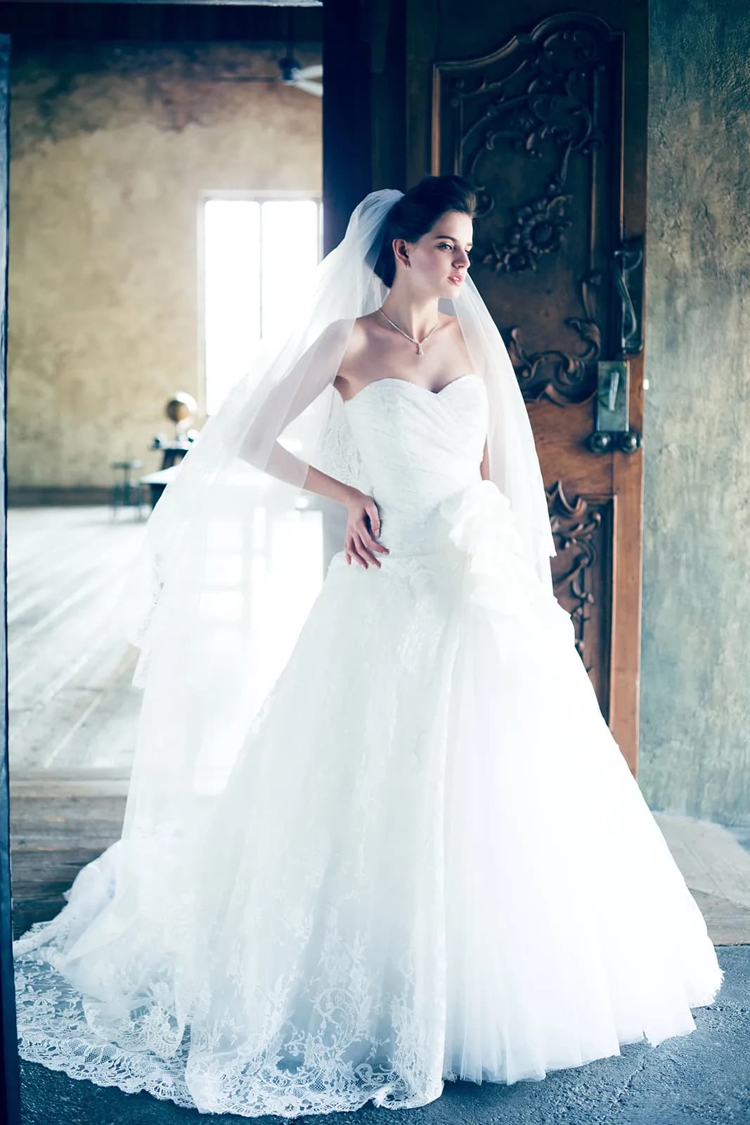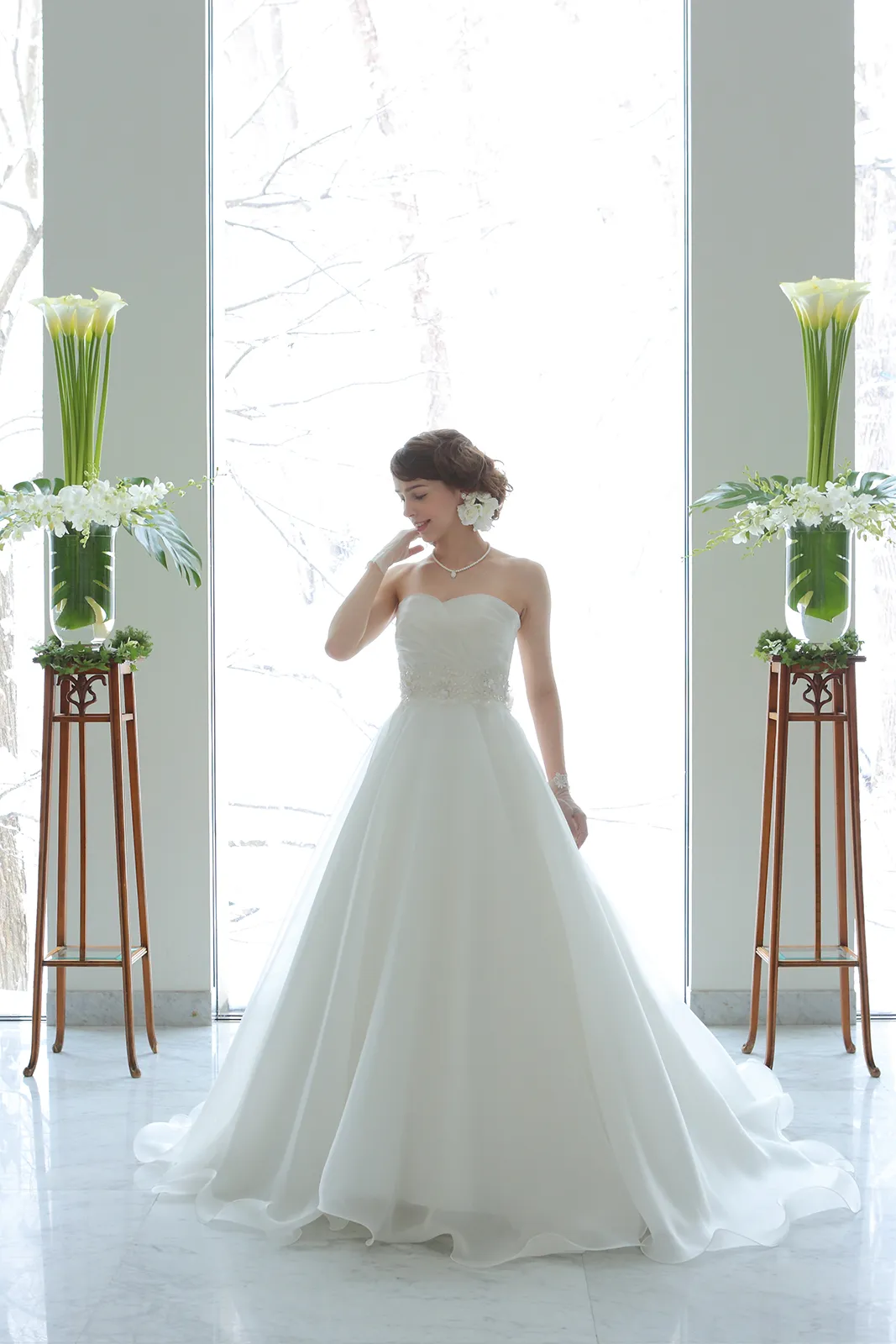 一生に一度のドレス選びはゆっくり時間をかけてお選び下さい。ご自身の好みや雰囲気に合うか等は、 ドレスのシルエットや素材感によって異なりますので、色々なドレスを着比べてみて下さい。 主に後姿が注目されるチャペル挙式をご希望されている方にとってはバックスタイルも非常に重要ですので、 トレーンの長さも大切なポイントとなるでしょう。自分を最高に輝かせてくれる運命の一着を見つけて、 素敵な結婚式の一日をお過ごし下さい。